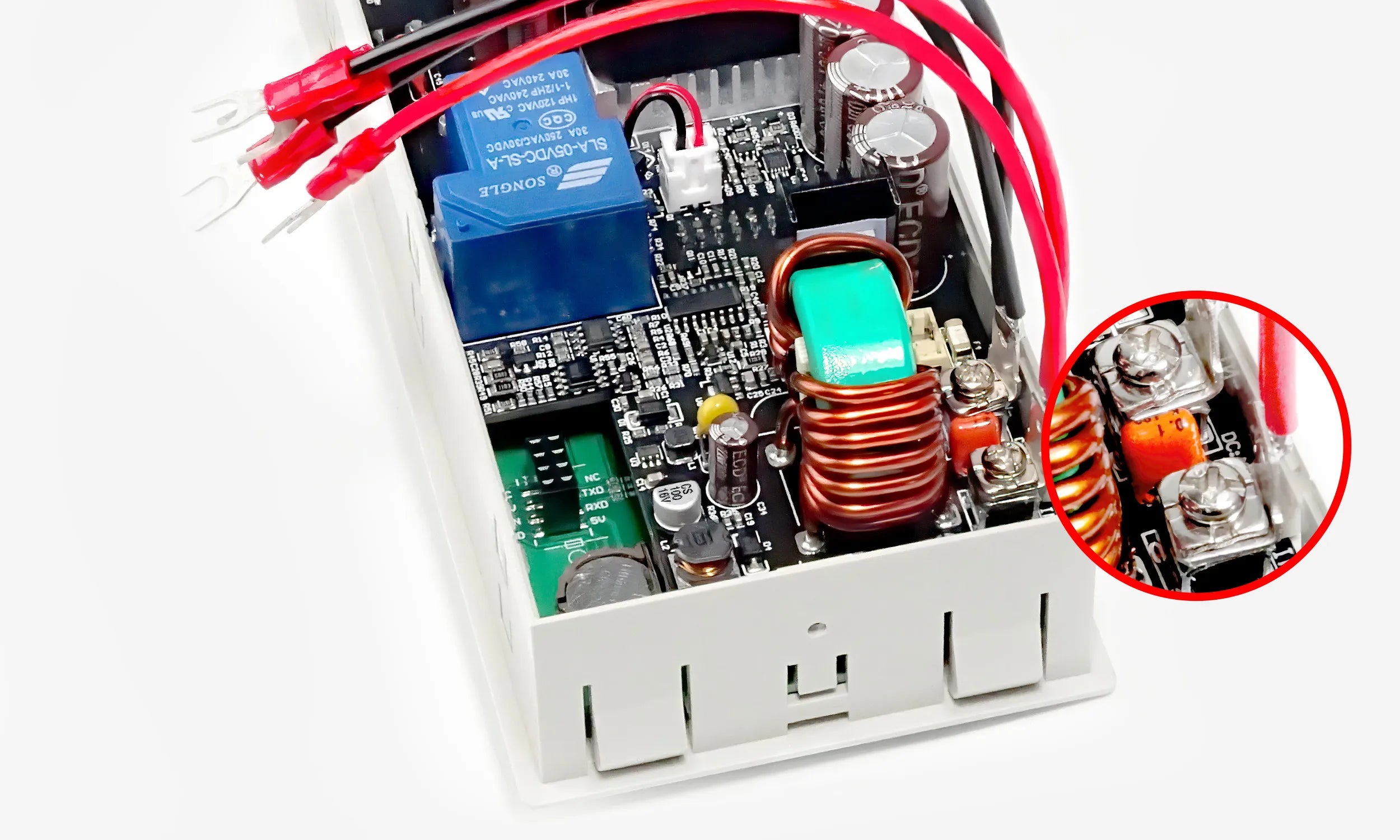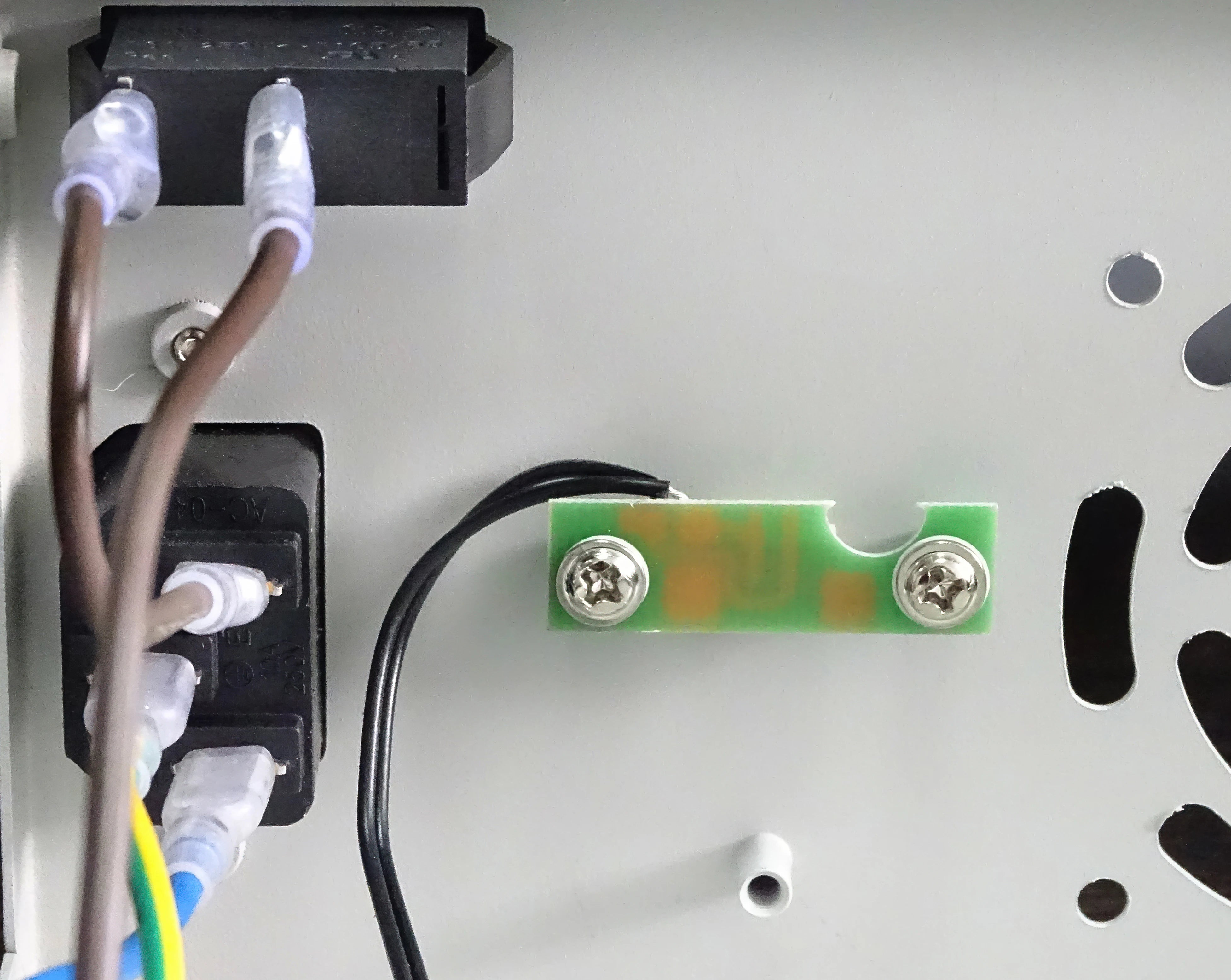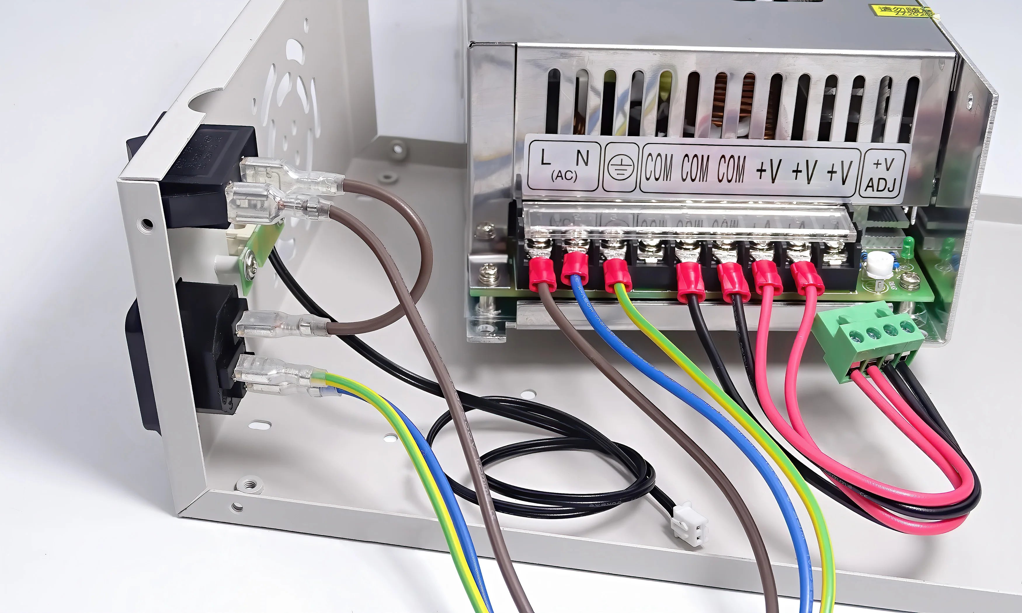 Use long brown cable to connect the rocker switch and the live wire (L) of the switch power supply; then use short brown cable to connect the rocker switch and the live wire (L) of the AC power socket; Use the blue cable to connect the neutral wire (N) of AC power socket and the neutral wire (N) of switch power supply; Use a yellow-green two-color cable to connect the ground wire (E) of AC power socket and the ground wire (〨) of switch power supply. Use two red cables to connect the IN+ of the green terminal and the positive electrodes (+V), and use two black cables to connect the (IN-) of the terminals and negative electrodes (COM). Install the temperature sensor extension board to the back panel.