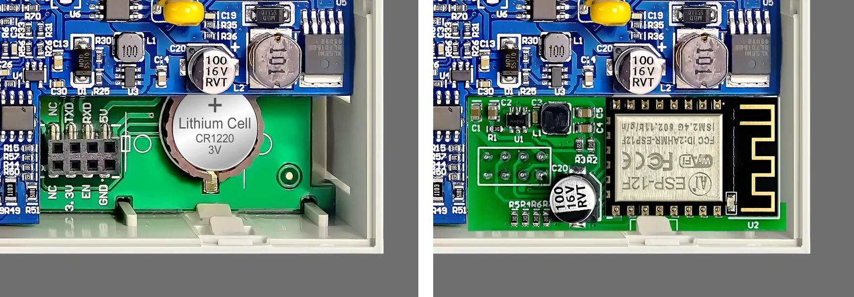 ⑦ RD60XX assembly: If you have CR1220 battery, please install the battery with the positive side facing up, if you have WiFi module, please install it like what shows in the picture. InstallRD60XX to the front side in the correct way, otherwise it cannot be installed properly, we make flame tight to prevent the RD60XX from shaking, if the case is slightly deformed, you can gently bend the case to make it straight.